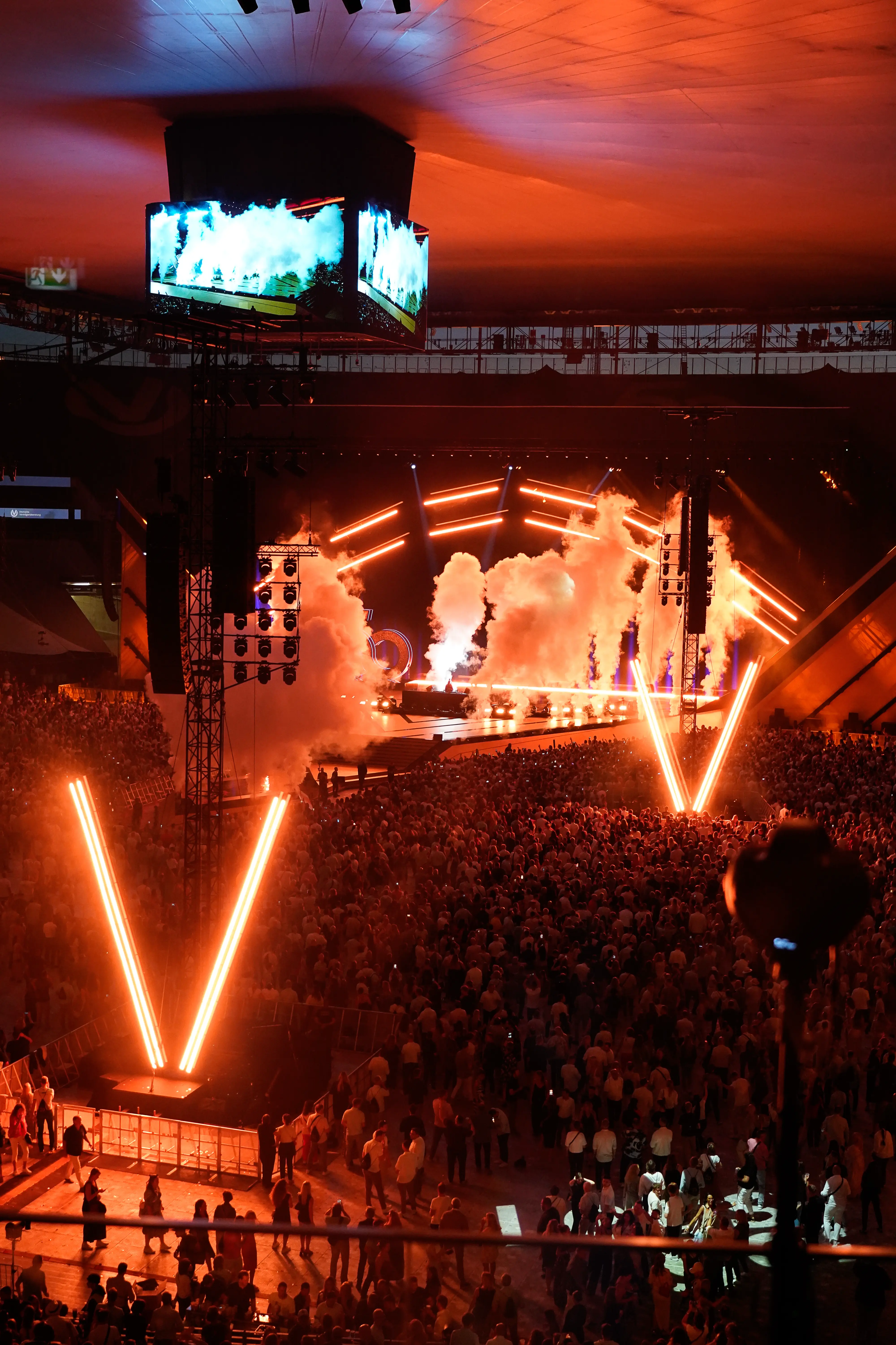 Eine Kamera wurde frontal auf die Veranstaltungsfläche aus einer Loge heraus platziert und erfasste das Gesamtgeschehen aus der klassischen Zuschauerperspektive. Eine zweite Kamera war direkt auf der Bühne neben den Acts positioniert und ermöglichte außergewöhnlich nahe Einblicke in die Showmomente. Die dritte Kamera befand sich im Publikum vor der Bühne und transportierte die Energie und Reaktionen der Gäste.