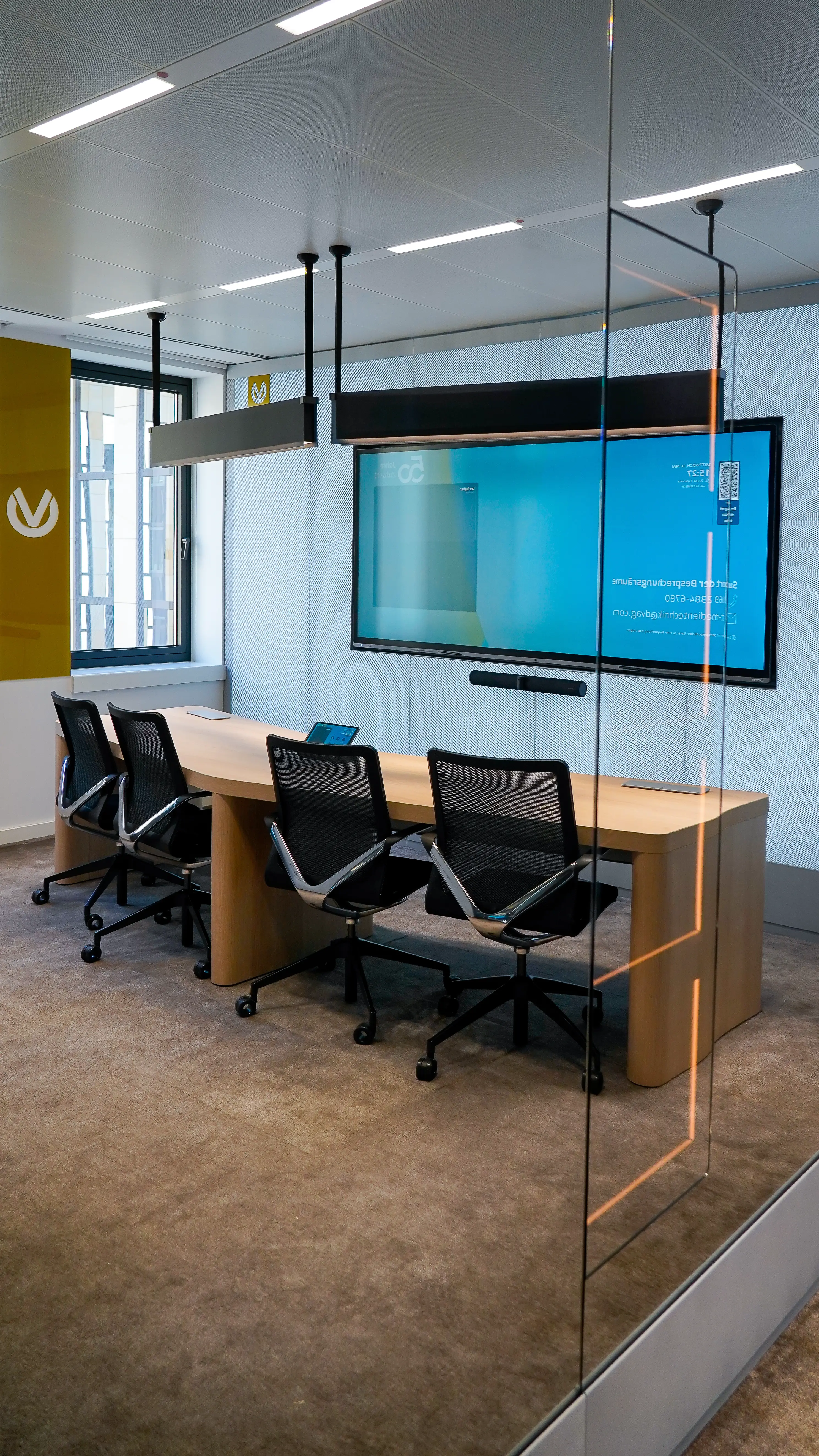 Ein zentraler Bestandteil ist der eigens entwickelte Konferenztisch. Statt eines konventionellen halbrunden Modells wurde ein pfeilförmiger, massiver Tisch in einem hochwertigen Holzdekor individuell designed und gefertigt. Er bietet vier Personen auf ergonomischen Linq-Drehsesseln Platz und positioniert sie im perfekten Winkel zur 180°-Kamera. Die gesamte Medientechnik für das Microsoft-Teams-System ist unsichtbar in den Tischbeinen verbaut, aber dennoch leicht und schnell zugänglich für Wartungsarbeiten. Zwei Anschlussfelder ermöglichen das Laden und Verbinden von Geräten sowie die Steuerung der gesamten Ambientebeleuchtung im Raum.