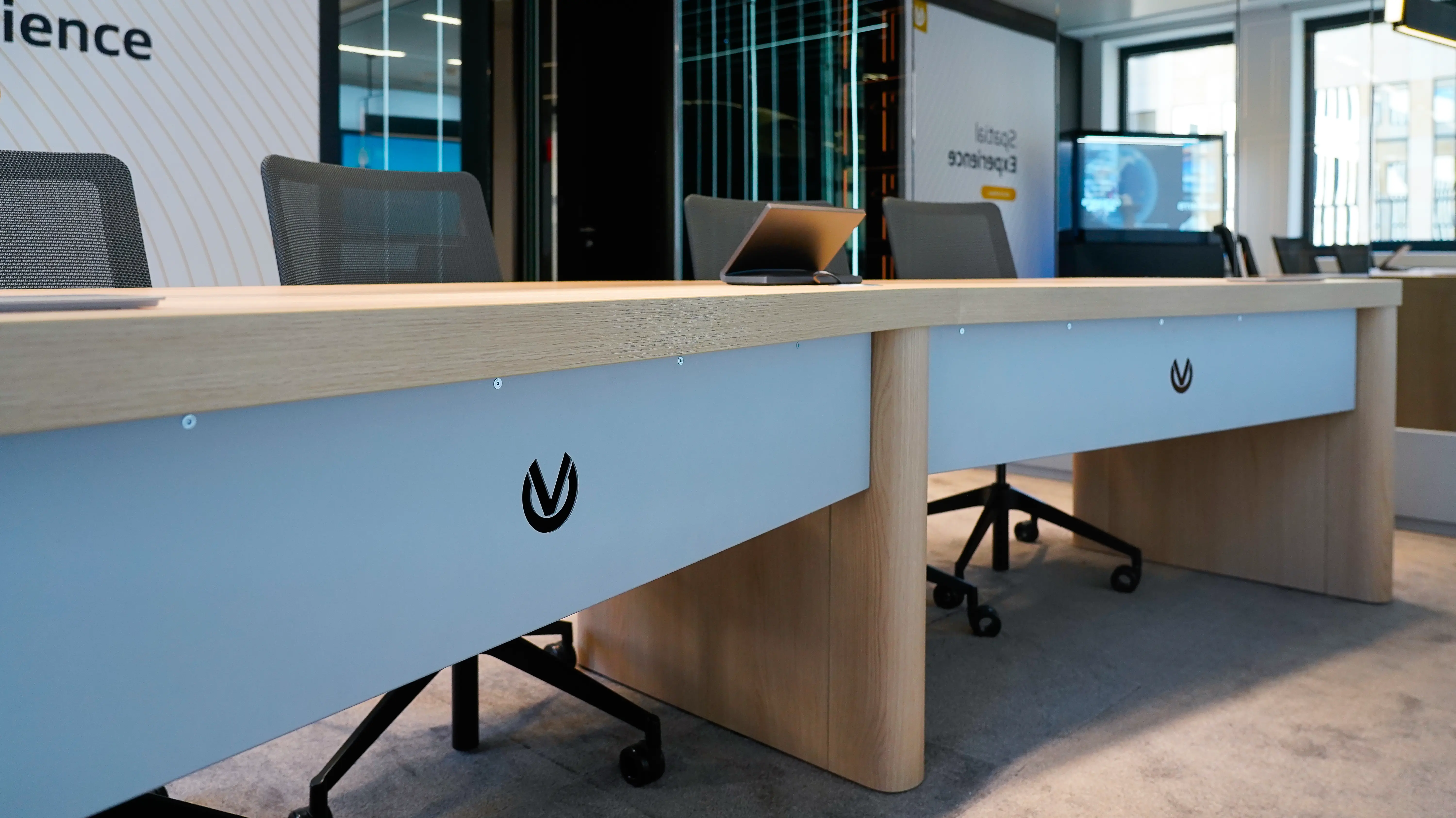 Ziel war es, einen stilvollen, funktionalen Raum zu schaffen, der Microsoft Teams Front Row ermöglicht und zugleich das Design sowie die Atmosphäre des VR-Bereichs aufgreift und weitere digitale Nutzungsszenarien unterstützt.
