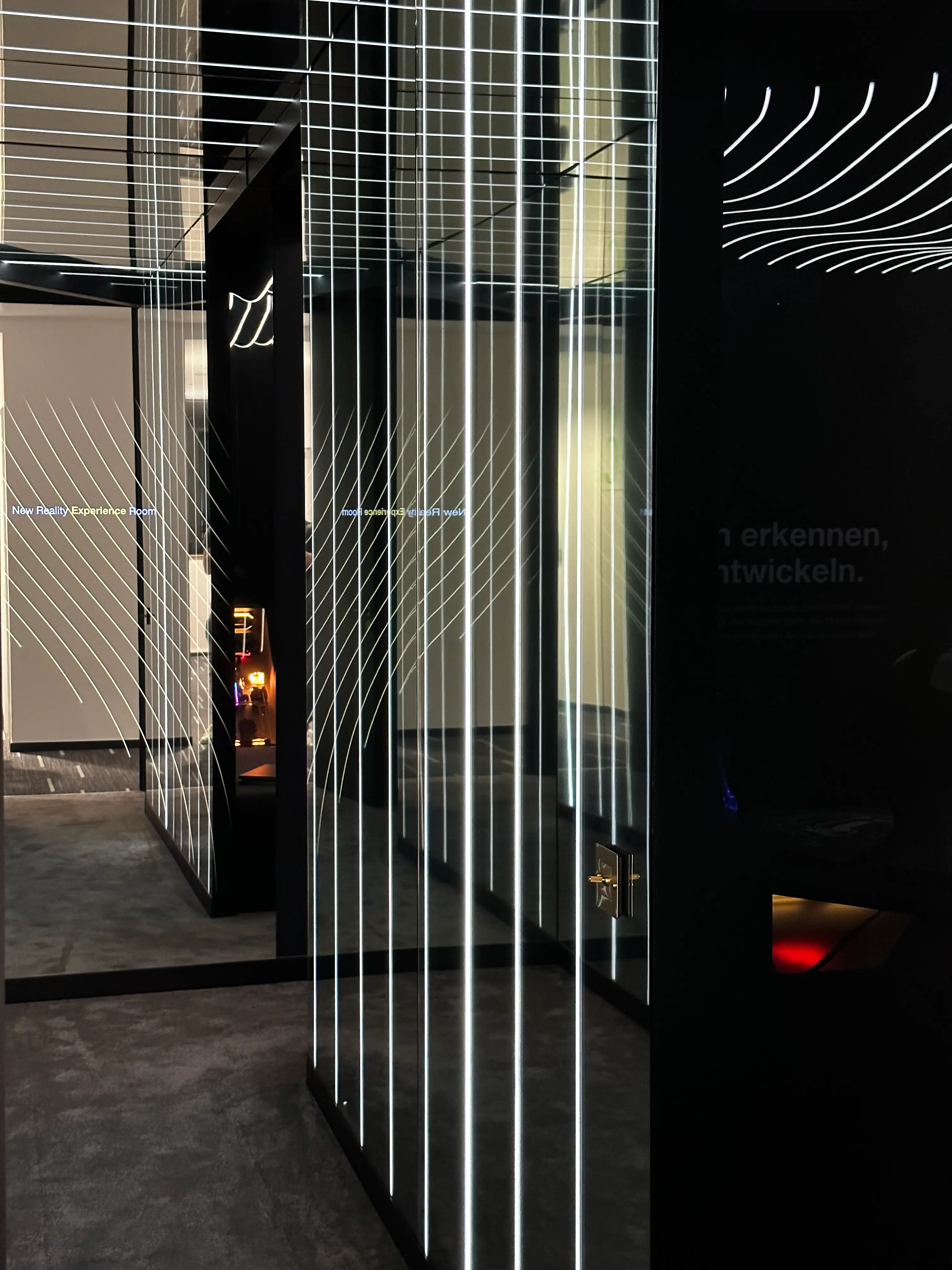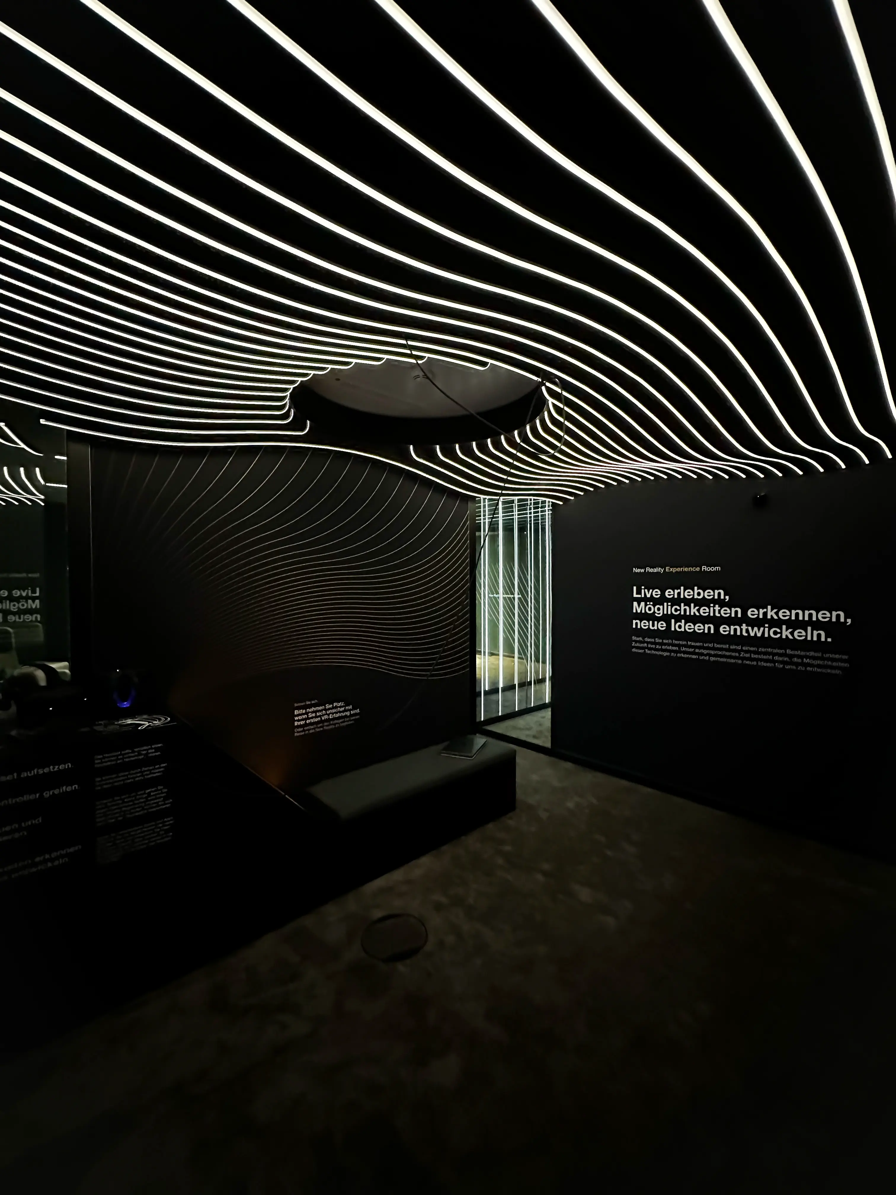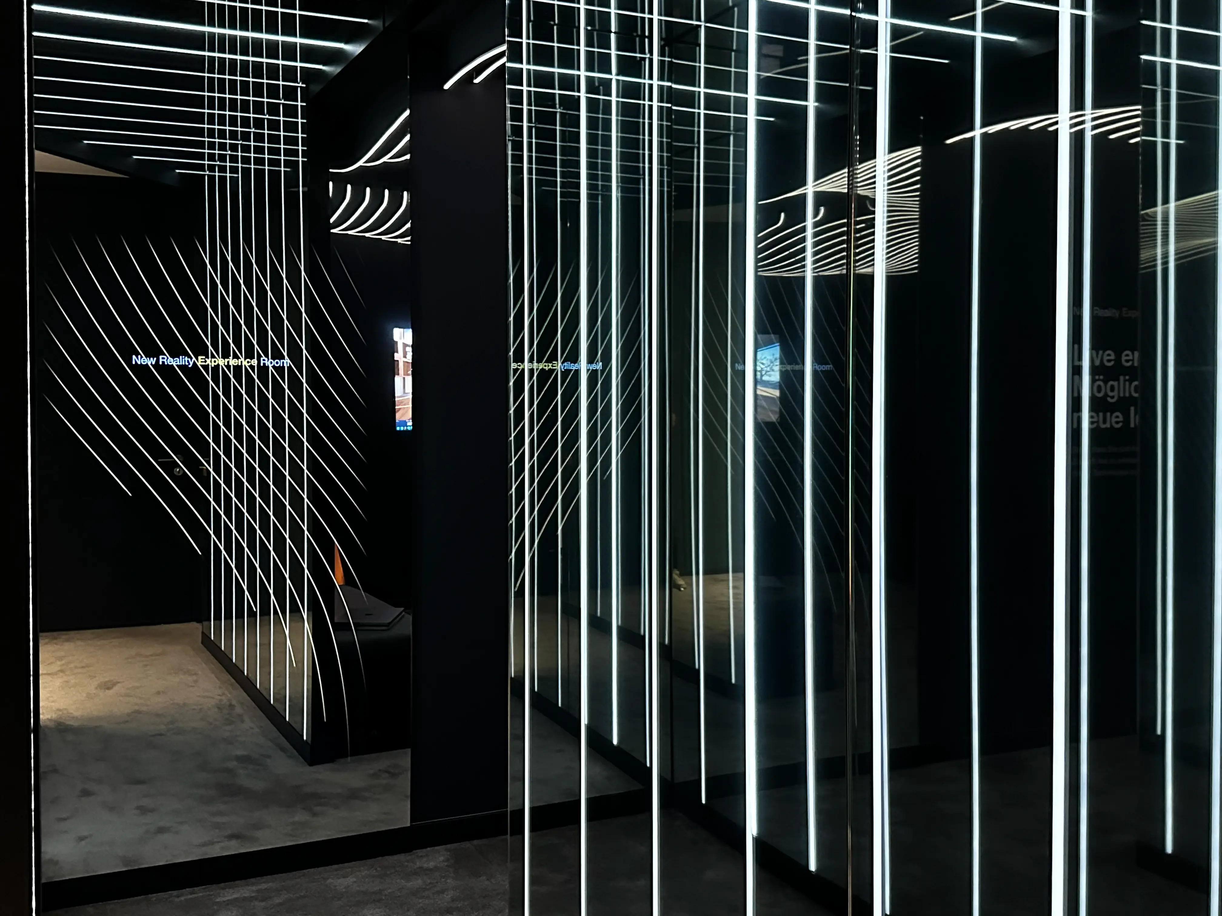 Beim Betreten führt ein verspiegelter Flur mit LED-Lauflicht direkt in die Erlebniszone, wo eine Kombination aus beeindruckendem Sound, Lichtinszenierung und visuellen Inhalten auf einem integralen Screen beginnt. Über 120 Meter einzeln gesteuerte COB-LED-Streifen in konturierten Deckenwellen erzeugen dynamische Lichtstimmungen, die zusammen mit der räumlichen Gestaltung und der verspiegelten Architektur eine starke Atmosphäre schaffen.