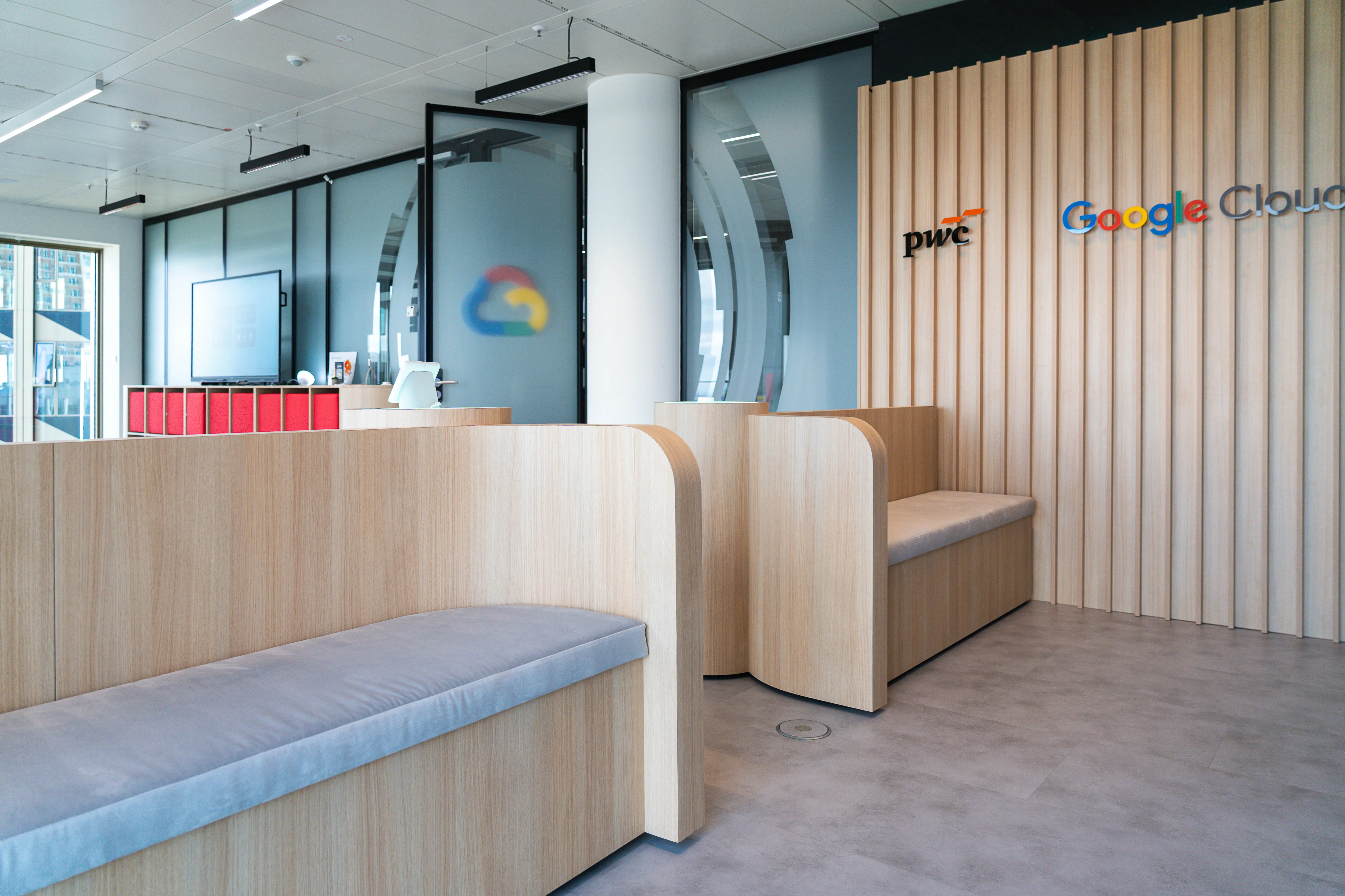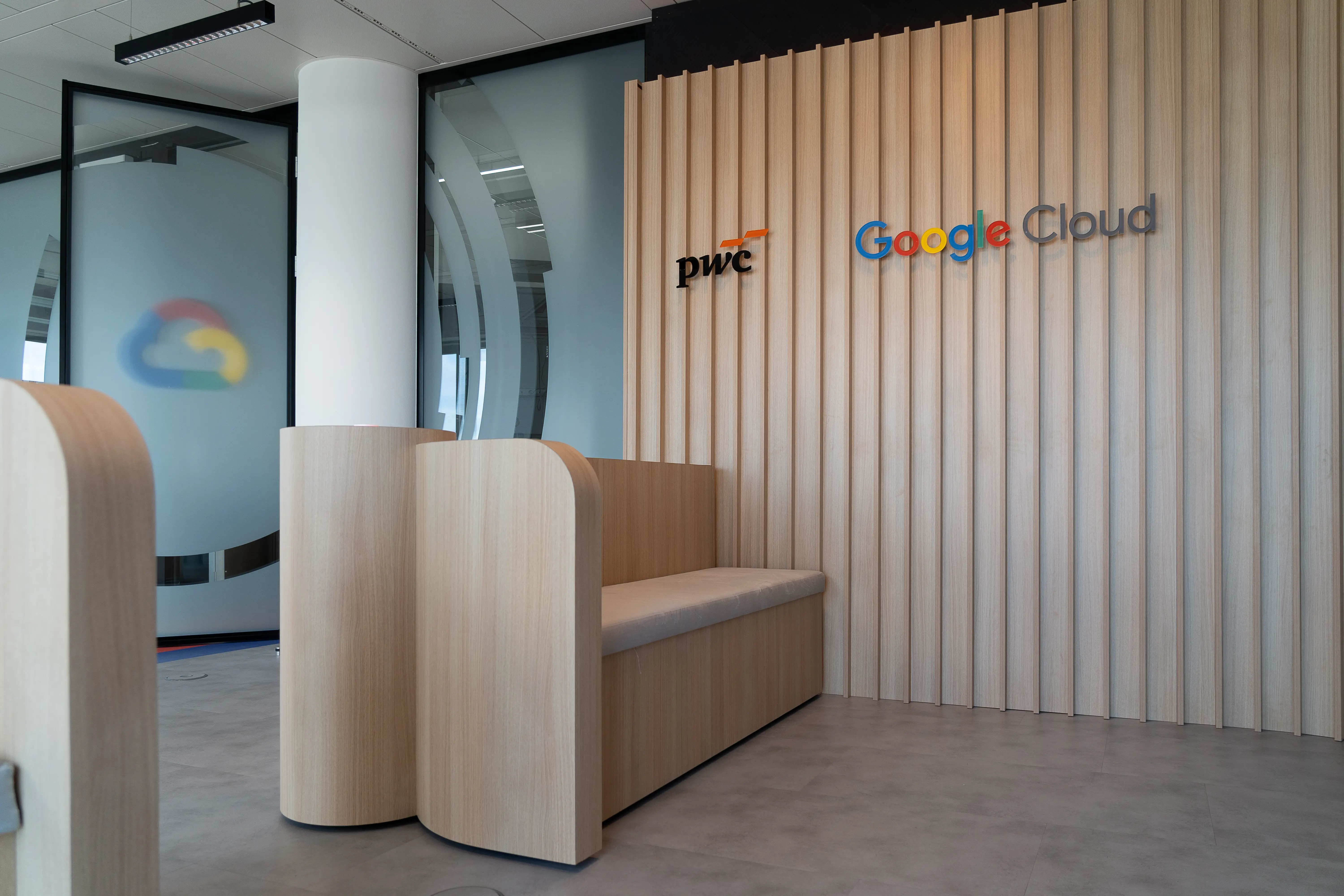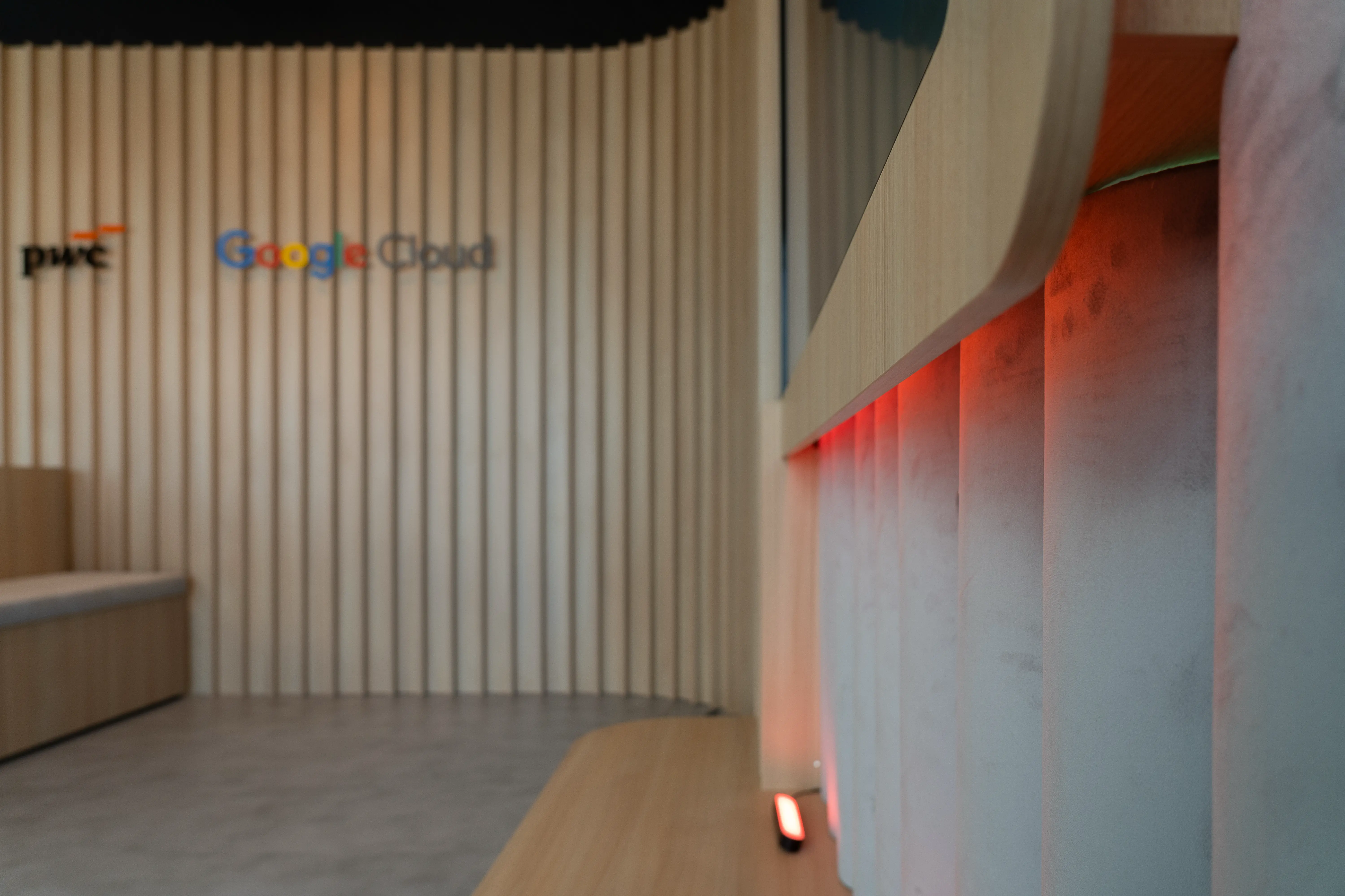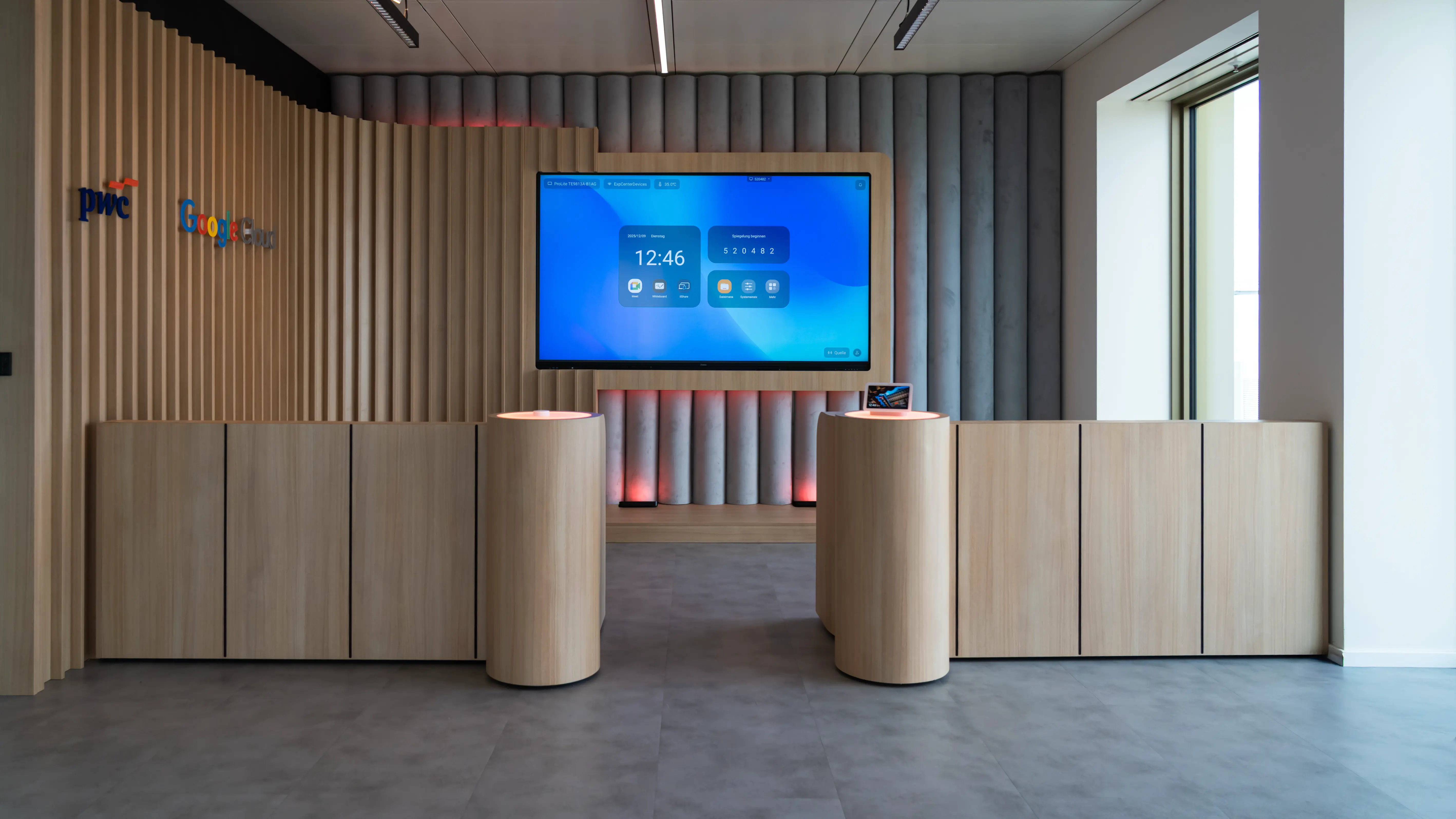 Der Raum selbst gliedert sich in zwei klar definierte Bereiche. Auf der linken Seite befindet sich die Stage: Eine individuell gefertigte, geschwungene Holzwand mit hinterleuchteten, gelaserten PwC- und Google-Cloud-Logos bildet den Fokus des Raums. Sie geht fließend in halbrunde textile Elemente über, die das indirekte Licht aufnehmen und zugleich die Raumakustik optimieren. In die warme Holzstruktur integriert ist ein 105″-Konferenzscreen für interaktive Vorträge. Die Zuhörer:innen finden Platz auf zwei individuell geformten, gepolsterten Sitzbänken, die dank Heberollen flexibel verschoben und an unterschiedliche Nutzungsszenarien angepasst werden können. An den jeweiligen Mittelachsen der Sitzbänke sind Säulen mit hinterleuchtetem Acrylglas positioniert, die Google-Home-Devices sowie die zentrale Lichtsteuerung aufnehmen.