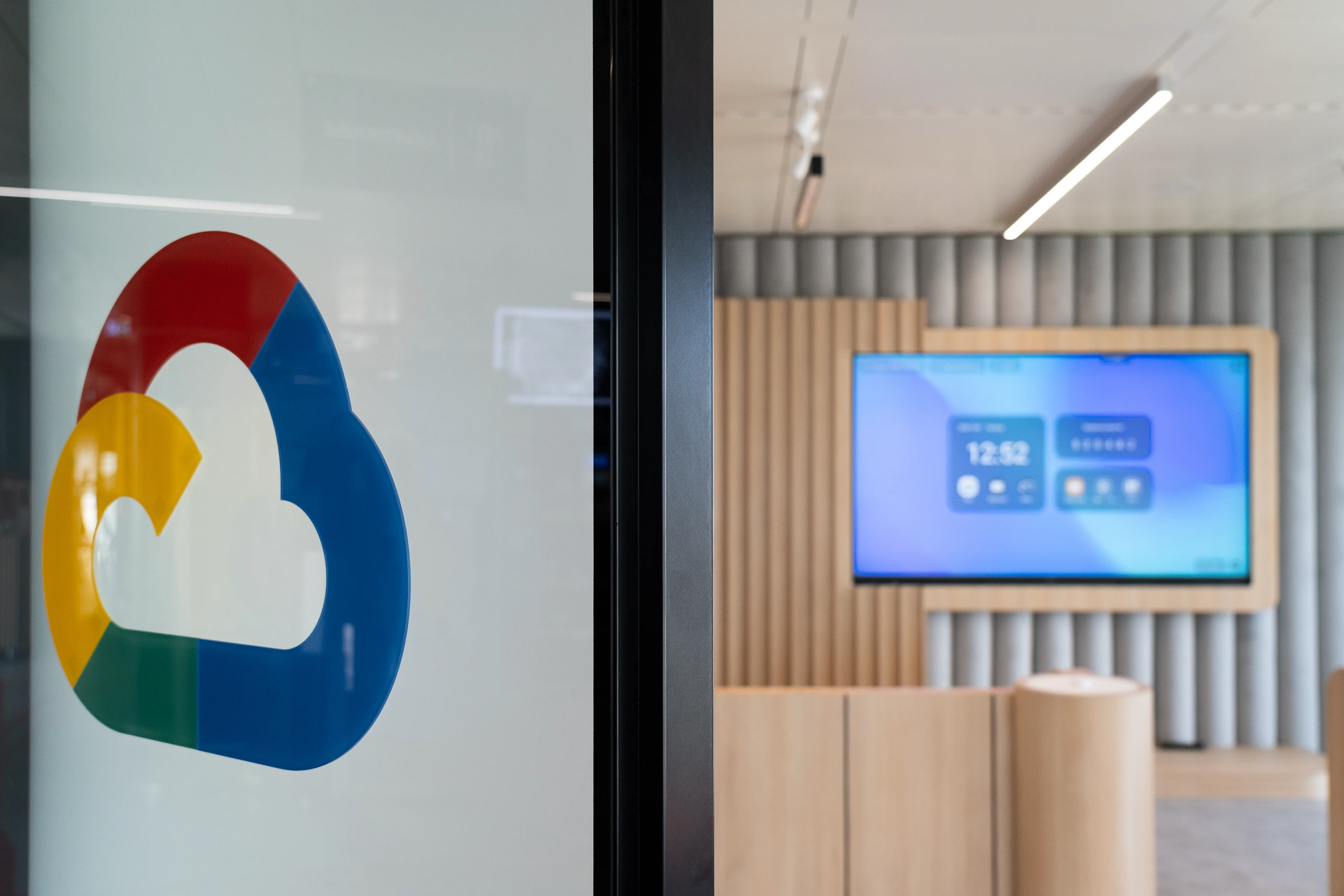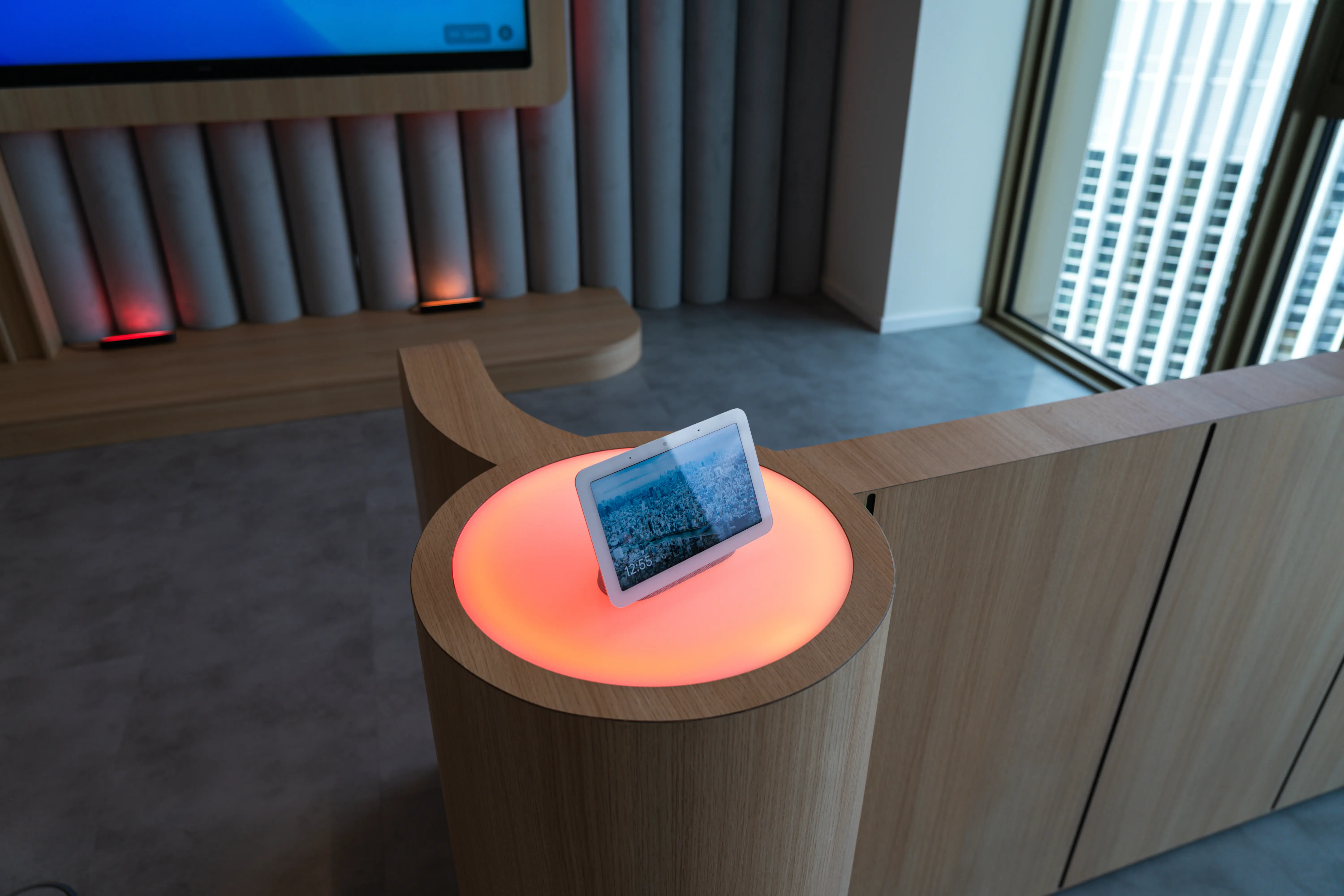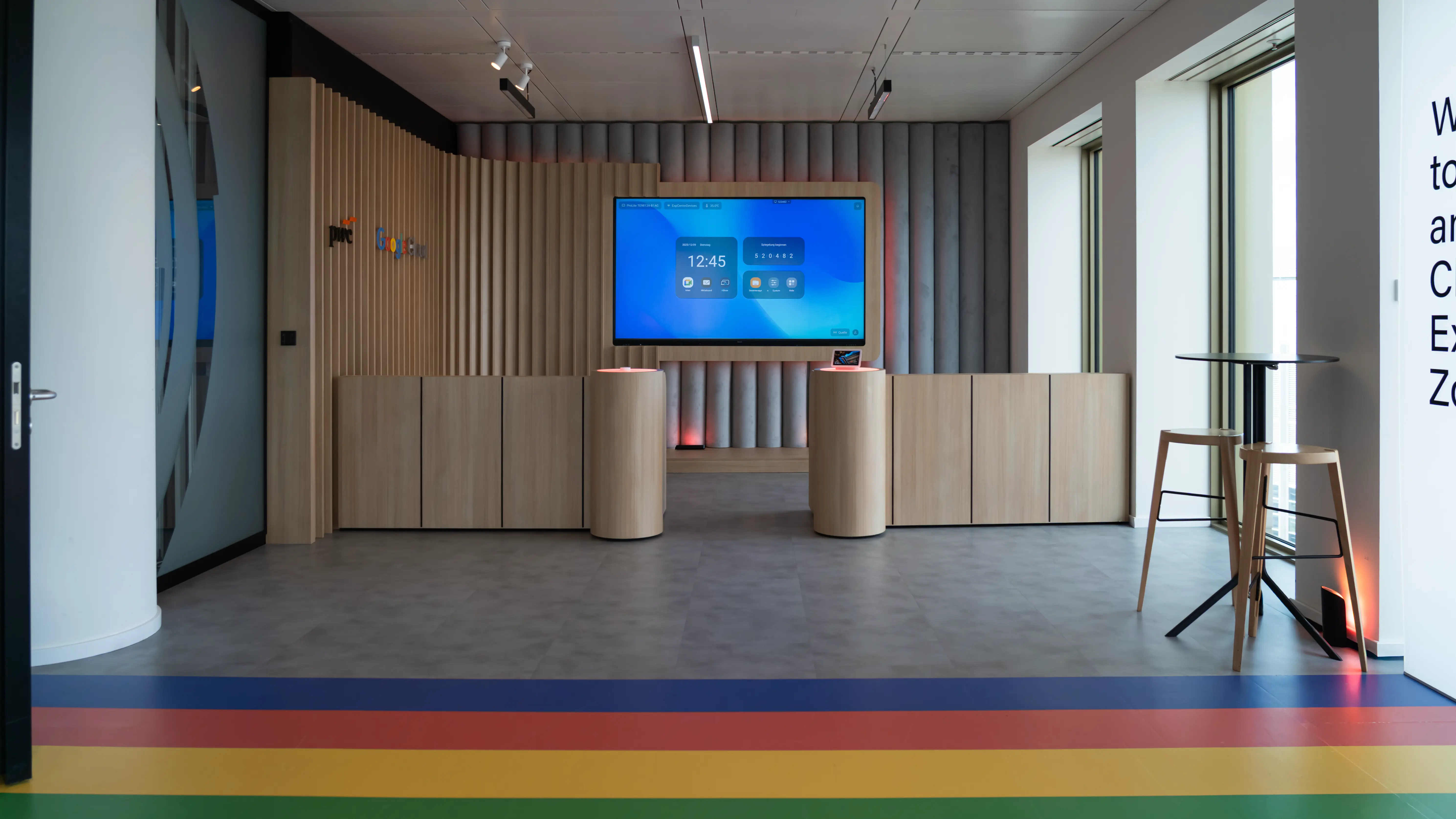 Die rechte Raumhälfte bildet die Workshop-Area. Hier wurde ein maßgeschneidertes Sideboard konzipiert, das bestehende Sitzwürfel integriert und gleichzeitig Technik aufnimmt. Ein 75″-Google-zertifizierter Touchscreen dient als Präsentationsfläche und digitales Whiteboard. Ergänzt wird der Bereich durch ein durchgängiges, individuell entwickeltes Lichtkonzept: Sämtliche Leuchten im Raum lassen sich über Google-Home-Devices, Bewegungs- und Türsensoren oder per App steuern. So kann der Raum auf Knopfdruck in den Farben von Google, PwC, neutral oder kundenspezifisch inszeniert werden – bis hin zu dynamischen Lichtstimmungen, die mit Content oder Musik interagieren.